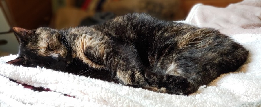 Lily, a black & orange tortoiseshell cat, happily snoozing